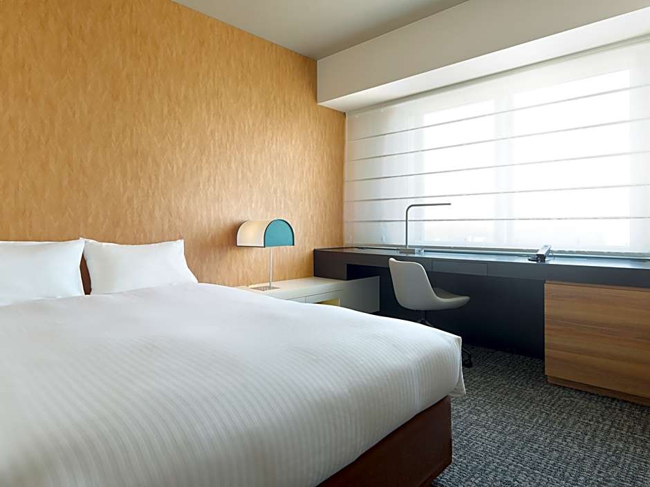 Contemporary air-conditioned room with wood furnishings, a 40-inch LCD TV and an air purifier/humidifier. A refrigerator and tea/coffee maker are provided.